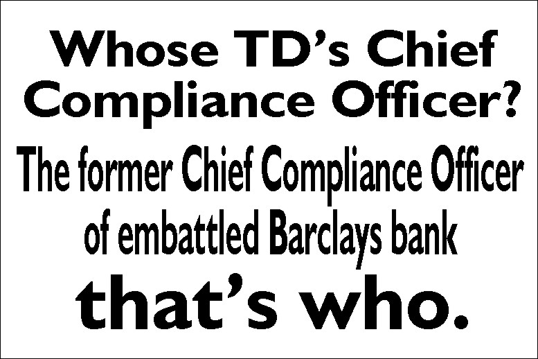 Whose TD’s Chief Compliance Officer? The former Chief Compliance Officer of embattled Barclays bank, that’s who. |