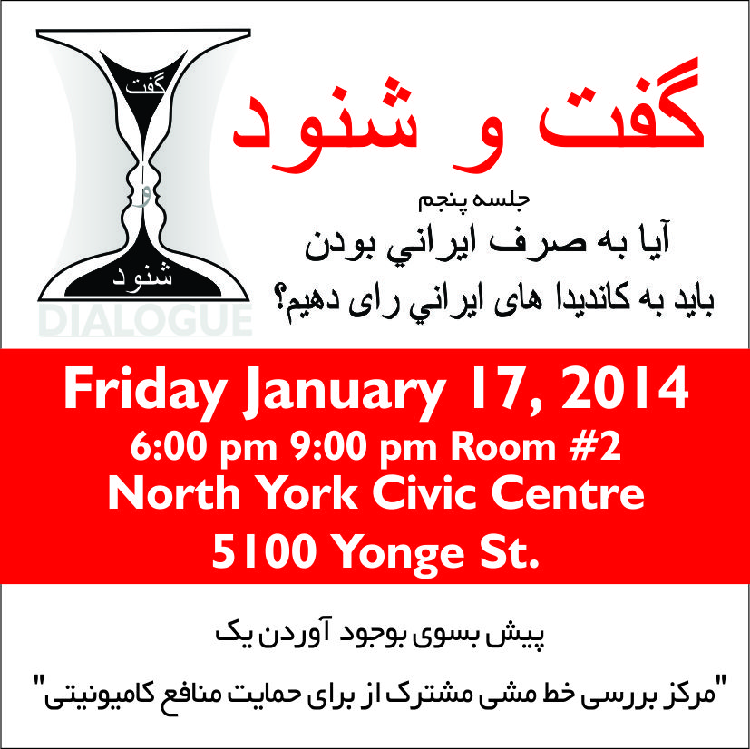 نحوه عمل خود، چه به صورت خلاصه مطلب اینکه در وضعیت فعلی اگر بخواهیم واقعا در این انتخابات موفق شویم، باید در روند فکری و عملی خود تغییری بوجود بیاوریم. فعالان، دست اندرکاران و علاقمندان باید دریابند که در اقلیت بوده و برای به حرکت درآوردن اکثریت جامعه میبایست اقدام به یک حرکت جمعی و مشترک بنمایند. و این نیازمند آن است که تک روی، رقابت و فرد اندیشی را به کنار گذاشته و سعی بر آن شود که یک برنامه و استراتژی مشترک بوجود بیاوریم. گروهی از کهنه کاران سیاسی و اجتماعی پنجمین جلسه " گفت و شنود" خود را به گفتگو درباره انتخابات آینده اختصاص داده اند. هدف بر این دارند که در این جلسه به گفتگو پیرامون ارزشهای مدنی در انتخابات و معیارهای گزینش کاندیداهای ایرانی بپردازند. موضوع اصلی این گفتمان را، رای به کاندید ایرانی یا به حزب و برنامه حزبی او تعیین نموده اند. ناگفته نماند که اکثریت افرادی که این گروه را تشکیل میدهند از کسانی میباشند که امید خود را از کامیونیتی از دست داده اند. در میان این افراد کسانی هستند که حتی مفهوم "کامیونیتی" را مغایر با منافع جامعه ای میدانند که در آن زندگی میکنیم، چه رسد به نیاز بوجود آوردن اتحاد در آن. این بهترین فرصتی میباشد که با شرکت در این گردهمائی آنها را قانع نمائیم که در خطا بوده و به جمع باز گردانیم. باشد که این یکی از اولین قدمهائی گردد که کدورت ها و منفی نگری های حاصل از تجربیات گذشته را به کنار گذاشته، و سال 2014 را همان سالی سازیم که سالیان دراز در انتظارش بودیم . از فرصت استفاده نموده و از تمام افراد کامیونیتی، فعالان سیاسی، اجتماعی و فرهنگی، بخصوص کاندیدا ها، نمایندگان و رهبران جامعه و رسانه ها دعوت میشود که در این گردهمائی که در تاریخ جمعه 17 ژانویه 2014 - ساعت 6 الی 9 بعدازظهر - اتاق شماره 2 - نورت یورک سیویک سنتر-5100 خیابان یانگ بر قرار میشود شرکت نمایند.